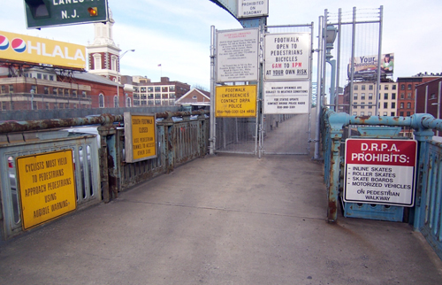 The walkways – each is about 12 feet wide at most points – run on either side of the bridge’s seven vehicular lanes and above the PATCO tracks, bordered by steel suspension cables, sturdy metal railings and light fixtures. However, only one walkway is open on any given day, and signs posted by the Delaware River Port Authority, which maintains the bridge, caution that crossings are “At your own risk.”